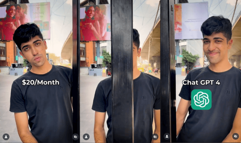 In this headshot, outdoors video, he uses a pole as a divider and moves side-to-side, changing facial expression while contrasting an AI Model with its price.