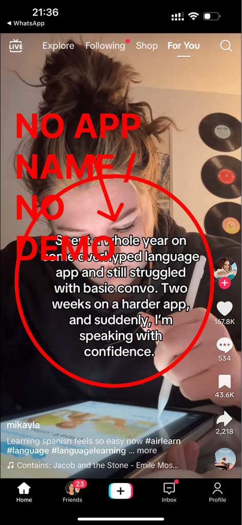 Short hook to demo. Hit and repeat until you find the short hook that works and the most “organic”-looking app showcase/demo.