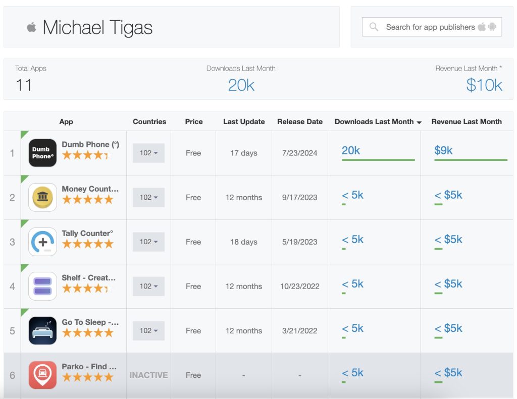 Before that, 8 other apps. Most still remain active and generating negligible revenue.