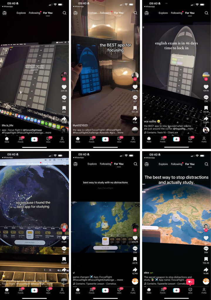 Most of the content is simple demos showing the app being set up and switching into focus mode. Some are raw laptop side shots, while others follow a more polished StudyTok setup.