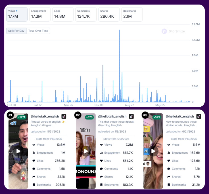 Format is similar, but they make some more “wrong” pronunciation videos, like this: => 4M views // 401K likes // 3.7K comments // 11.8K bookmarks