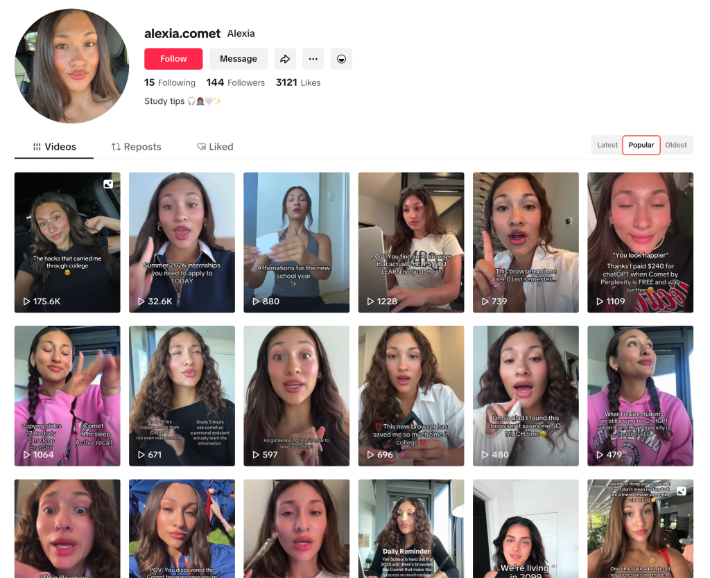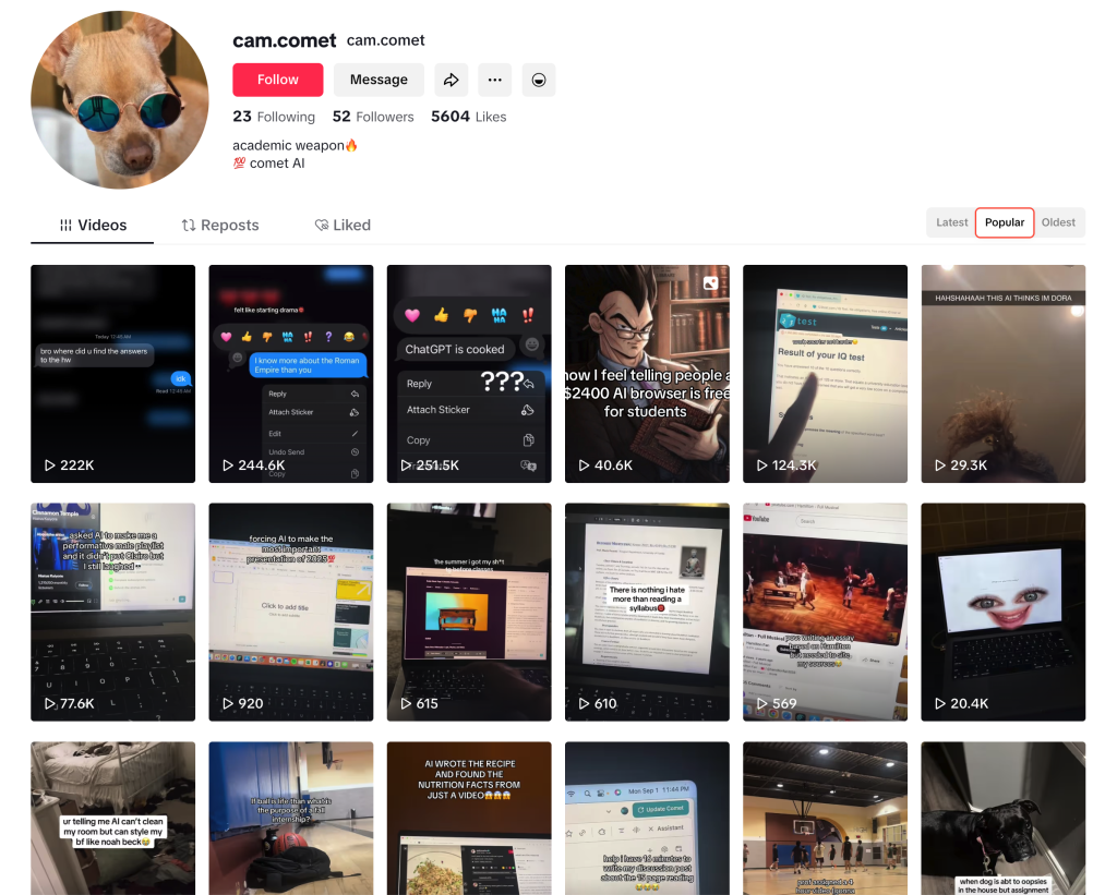 They don’t yet have many views or much success, and they mostly seem to target students during back-to-school season, trying to convert them into using their AI browser.