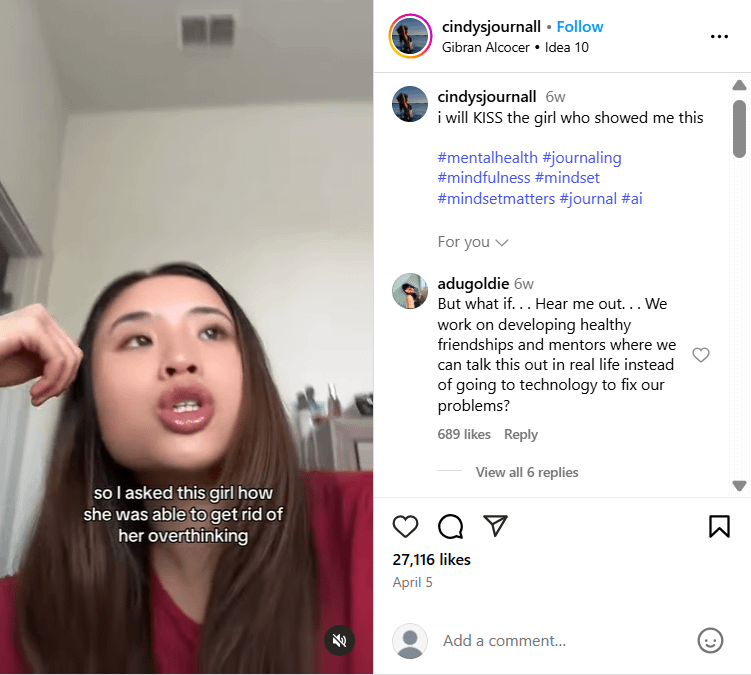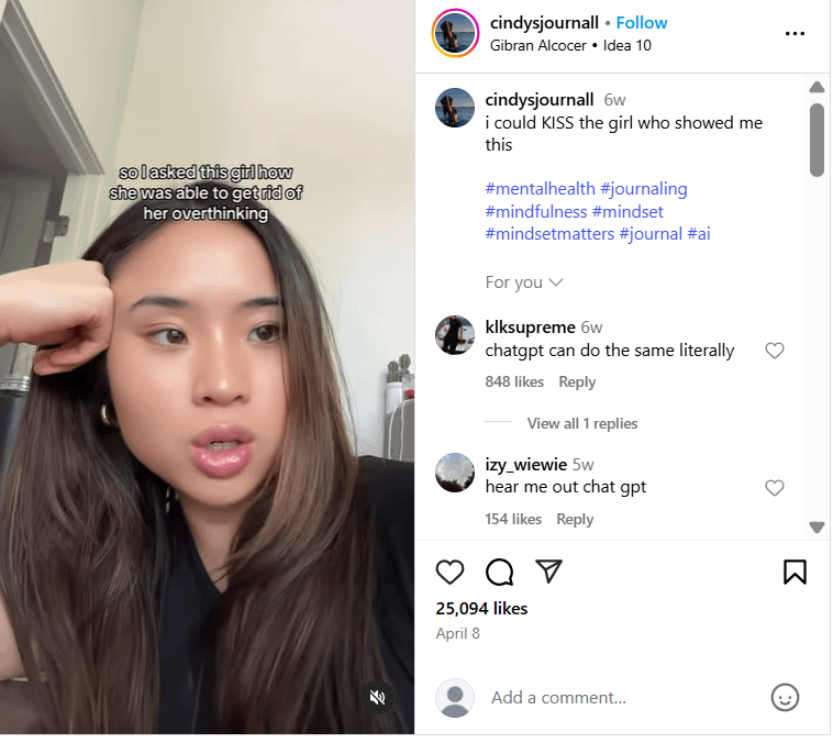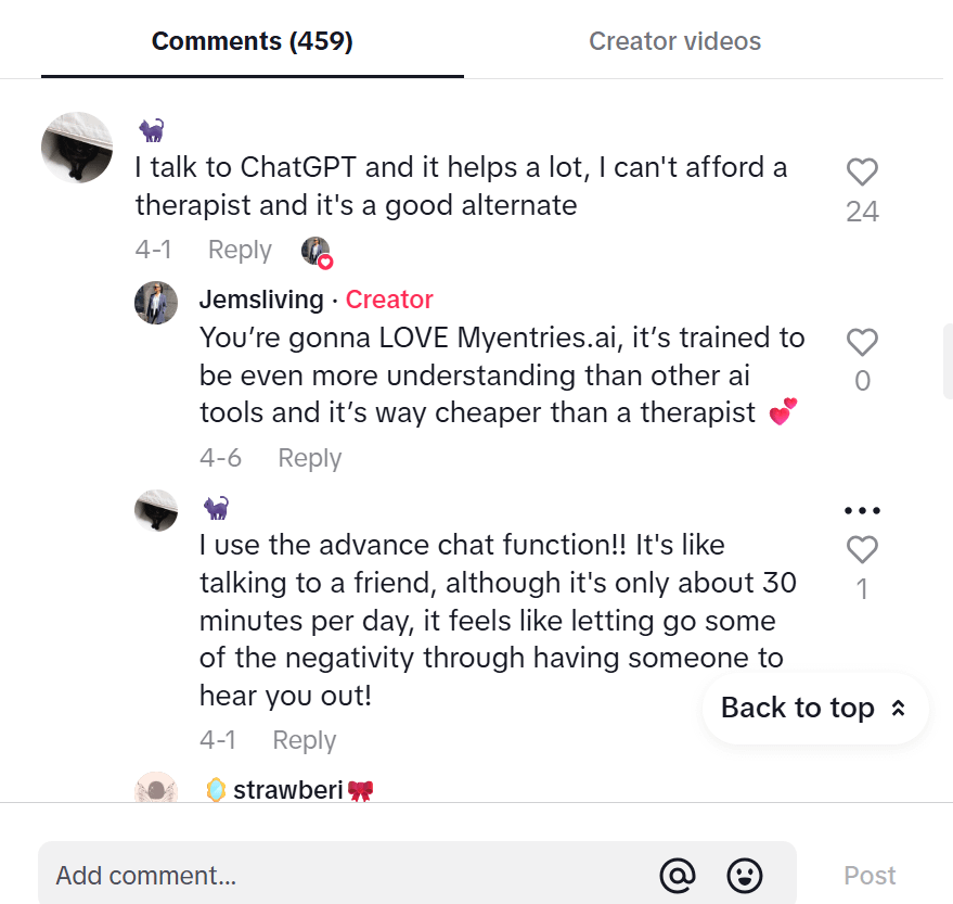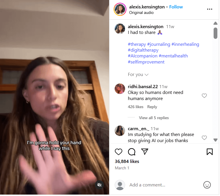 5 days later, they had reached 1.5M views with the same creator. She shows how “AI therapy is better than human therapy” with a screen recording of the website.