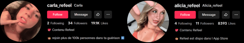 Each TikTok account is branded as an ambassador, using the username format “name_refeel.”