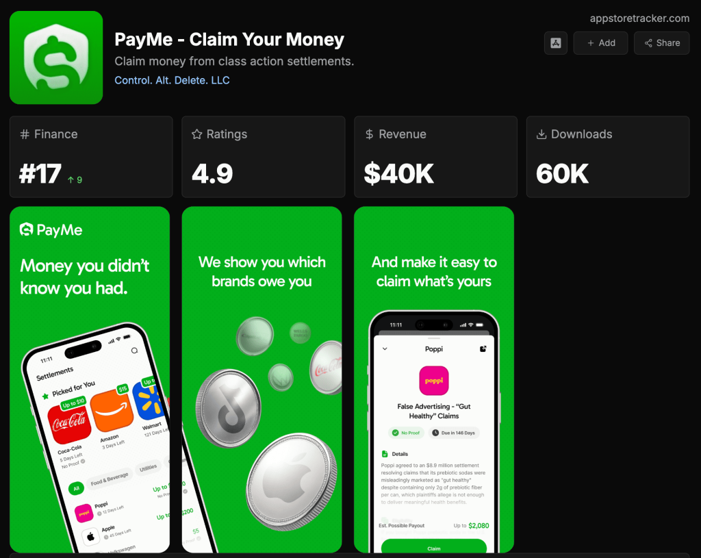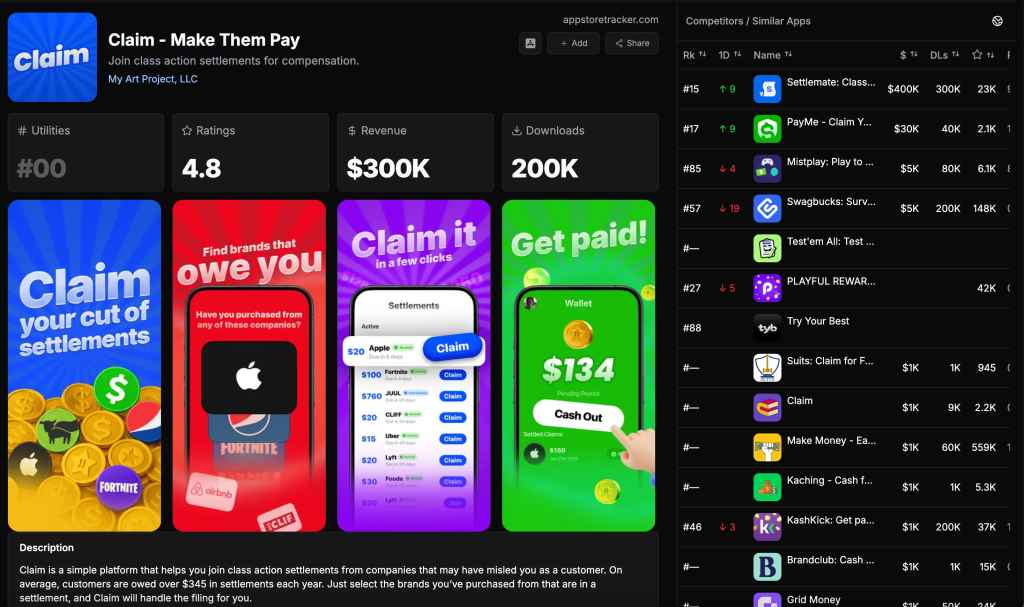 This new make-money class action app is following in the footsteps of Claim and Settlemate, already reaching around 40K–60K downloads.