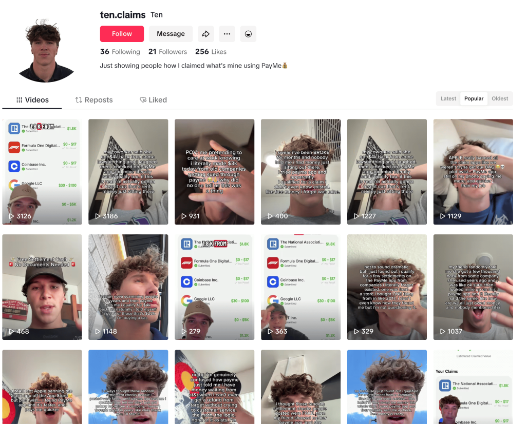 They’re mainly posting long-hook face overlay videos, but they’re also testing talking videos. Results haven’t been huge yet, but it’s worth keeping an eye on because Claim and Settlemate took off really fast.