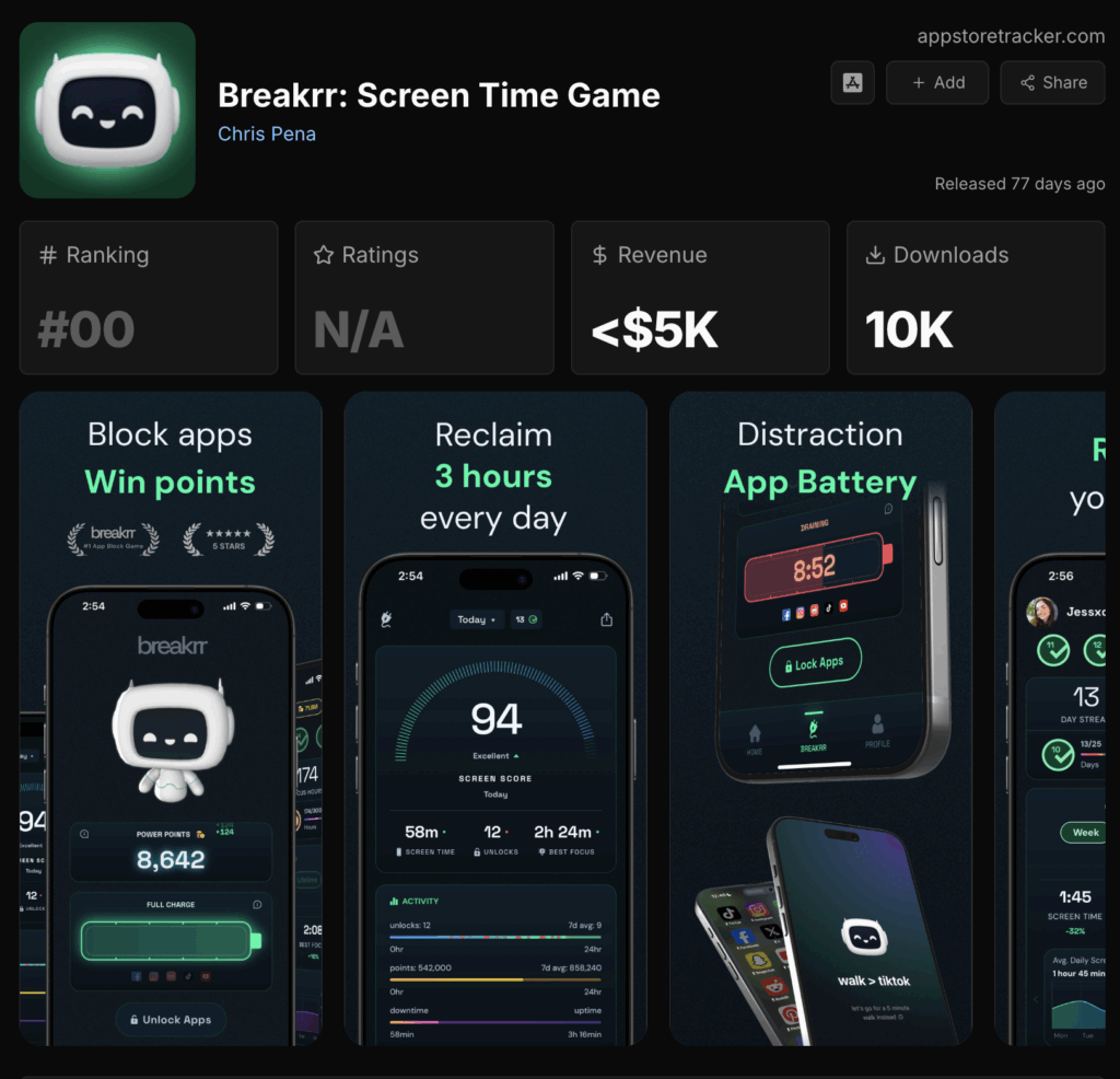 Breakrr was launched just 77 days ago and has already reached 10,000 downloads. While its revenue is still under $5,000, the app stands out by turning your time off-screen into a game, a smart and proven take on digital wellness.