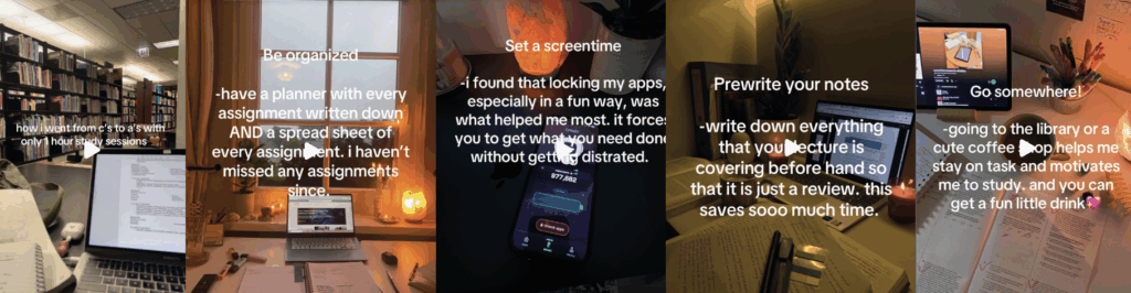 Each video includes a hook on screen that highlights the struggle of trying to stop scrolling and focus like “Stop scrolling” or “It’s back to school, not back to scrolling.”