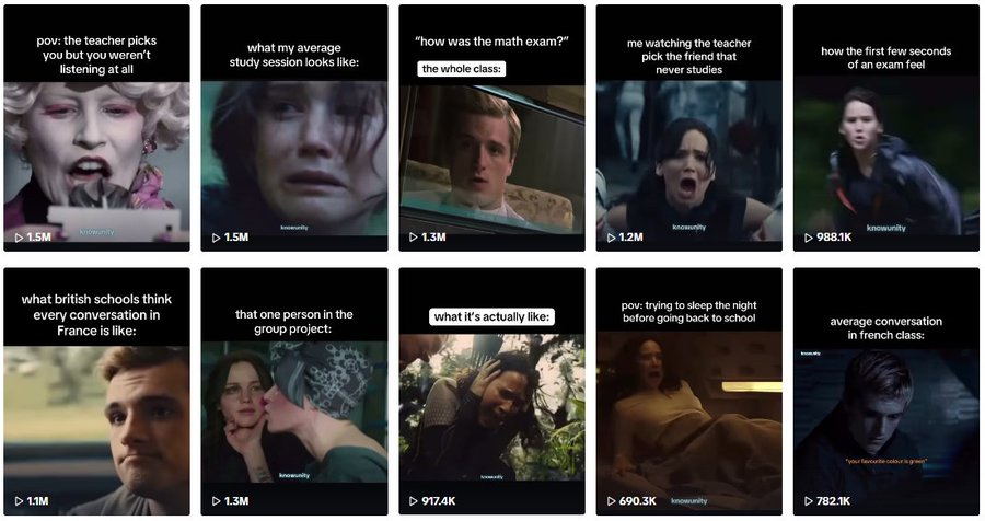 Turning clips of the Hunger Games series into memes by framing in black background + adding funny white text hook