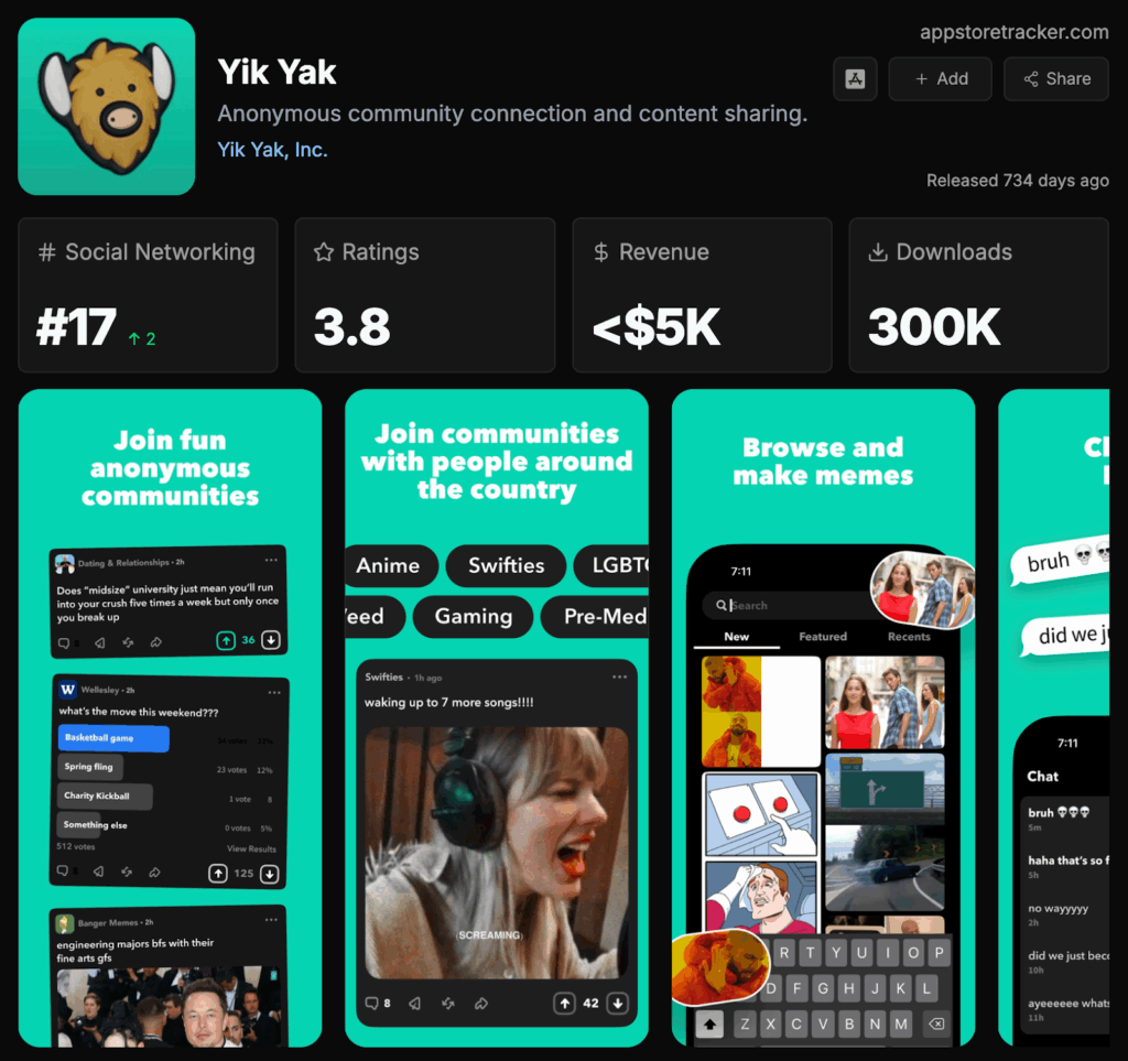 Yik Yak is a social app launched in 2013. It quickly became a favorite on college campuses across the U.S. The idea was simple: post whatever you’re thinking to people nearby, no names, just local vibes.