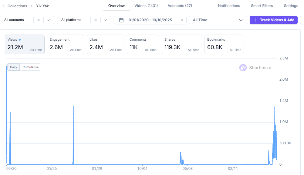 From the charts we’ve been watching, there were long gaps with no posts, but then things picked up again in September. Now the app has hit 20 million views.