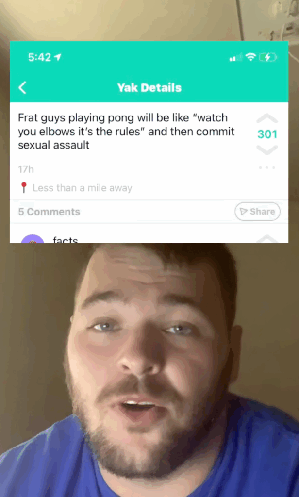 - “my embarrassing moment on yik yak when I was at the fraternity party and tried to”