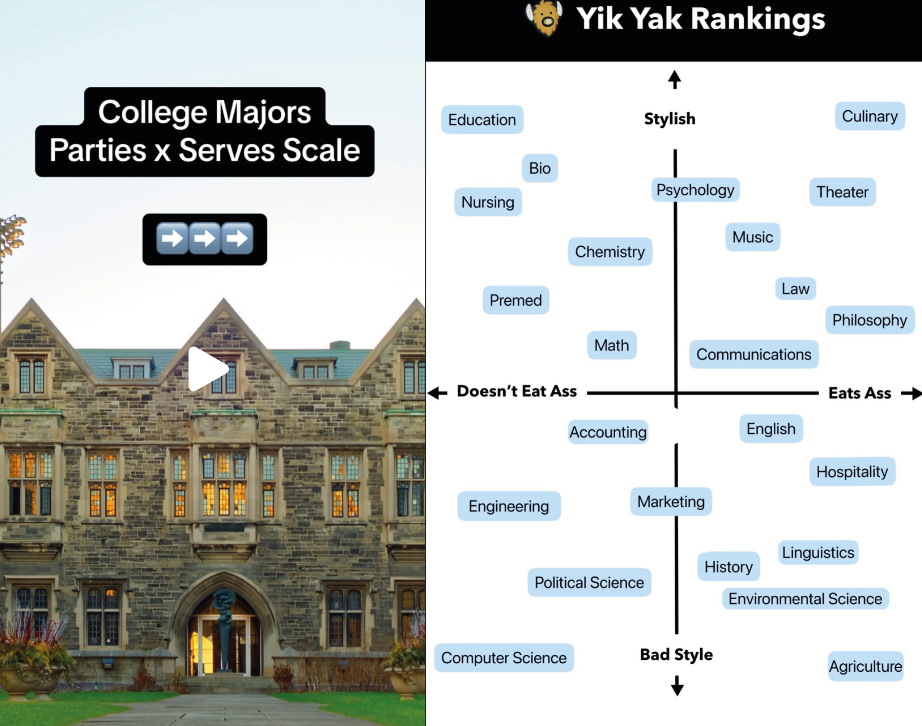 At the heart of it, these are social and cultural jokes made anonymously on Yik Yak. They stereotype students and courses using two simple axes, like party level vs. attitude. Easy to get, fast to share, and relatable.