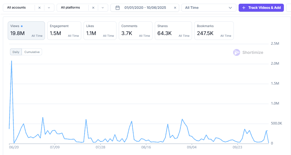 You can track her accounts here and grab inspiration from her hooks (spoiler: it’s all in different niches) -> https://app.shortimize.com/c/2b10COfpX5eVqy