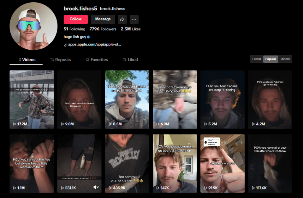 Clips like “bros got Pokémon Go for fishing” (17 M views) and “POV: I tried to make a ranked fishing app” (9.8 M views) are their best hits.