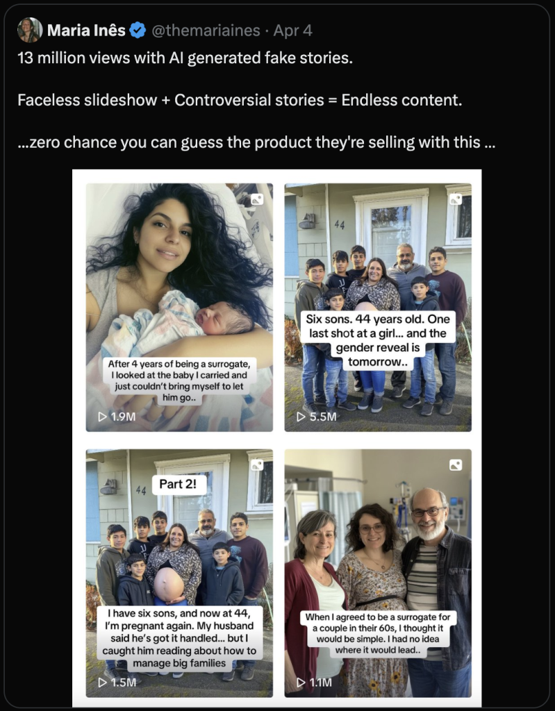 Same strategy as those e-com brands do with mass-posting carousels or AI avatar random twisted stories where they insert their “shampoo” or “vitamin” brand at the end…