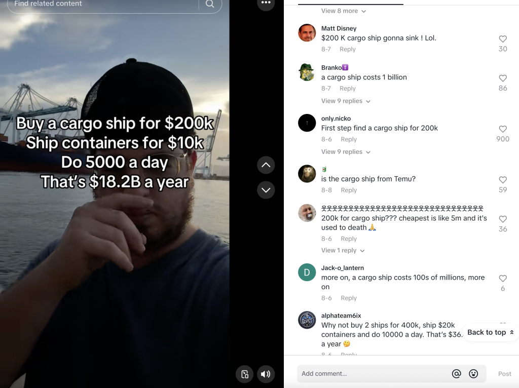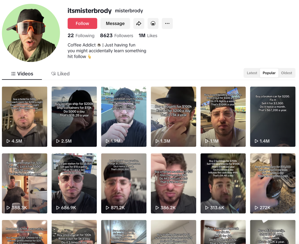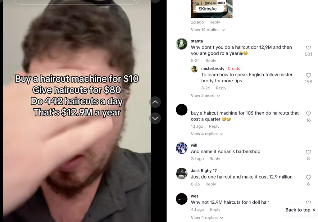 What really drives engagement, though, is throwing in random math that’s obviously wrong, full of mistakes, or just plain inaccurate. One small account we found is doing this and has racked up 14.8M views from only a few videos.