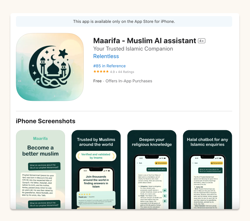 Still huge untapped opportunities with Muslim apps. This morning I saw the first Muslim AI assistant app breaking top #100. Let’s see how long it takes them to break into #10.