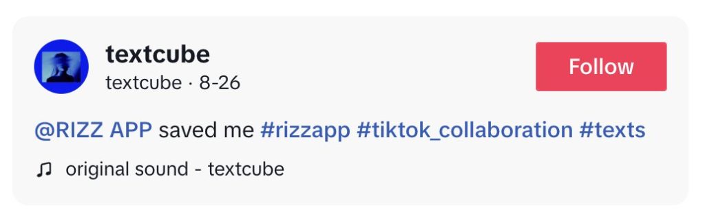 They all do videos like this with most being 2 to 5 minutes long. They use B-roll with text story overlays, either with a caption promoting the RIZZ app or a screenshot/name of the app inserted into the video.
