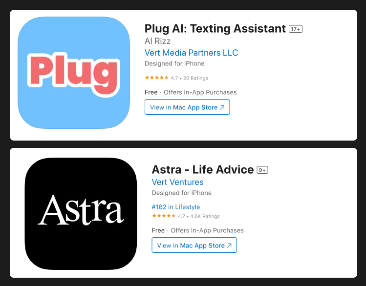 So I tried digging deeper and found that Astra and PlugAI seem to be made by the same entity (even though they have different apple “developer” names):