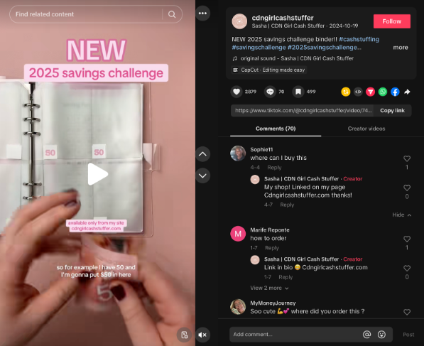 Where she also sells her “cash stuffers envelopes” and “savings binders”:
