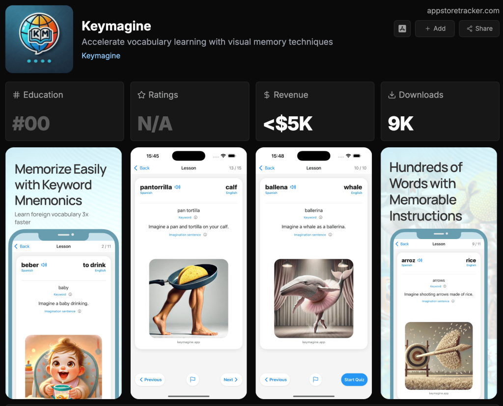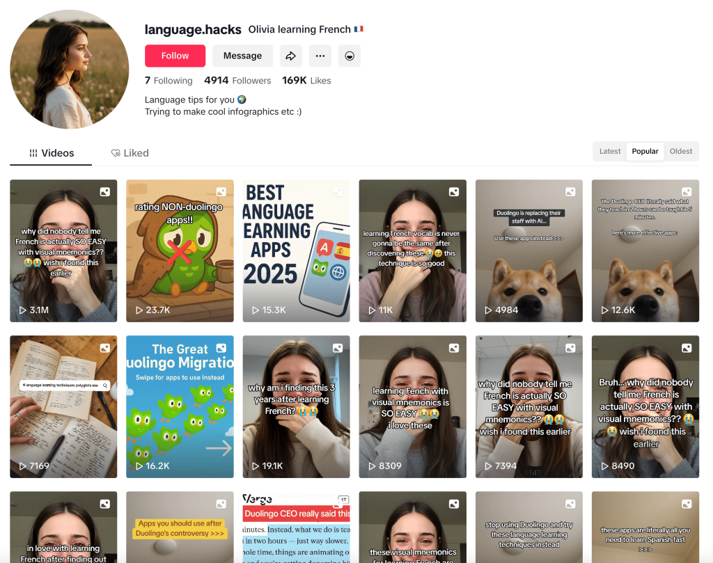 Although downloads are low, this language learning app had a win with a slideshow that reached 3.4 million views on a faceless AI UGC slideshow account.