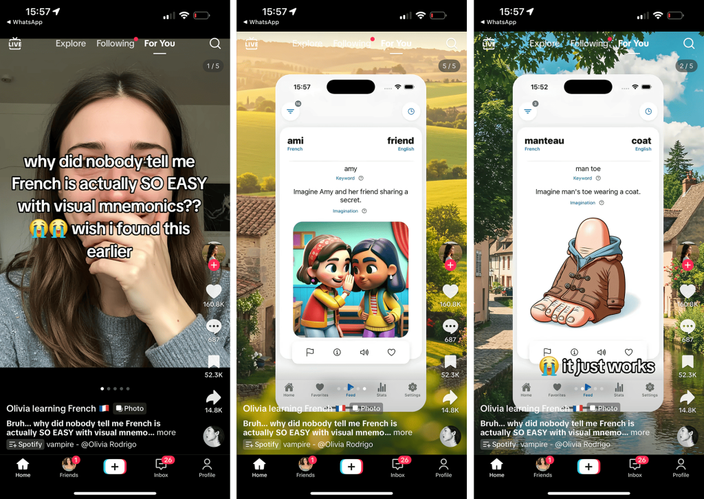 They have been making two types of slideshows. The first one is the “crying” face with a short hook. Usually, the hook is something like “why is French so hard,” but here they changed it slightly.