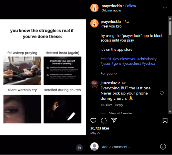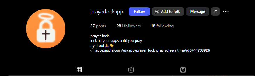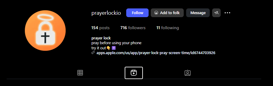 Every video carries a Prayer Lock watermark, which builds brand recognition, though the explicit download CTA on those reels doesn’t always feel optimized for conversion.