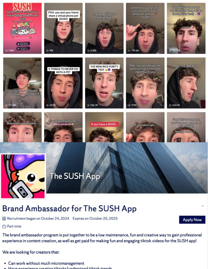 Social app SUSH also launched its own TikTok ambassador program three weeks ago.