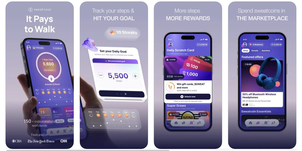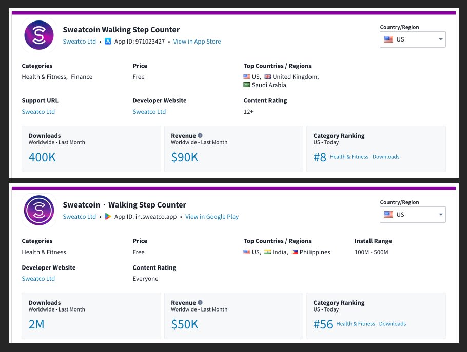 Sweat Coin (released in 2016), is a step-tracking app that allows users to turn their everyday walks into points. “Sweat coins” can then be used to purchase in-app rewards (ex: Walmart/Amazon voucher, discounts on Apple Watched, etc)