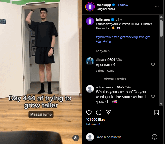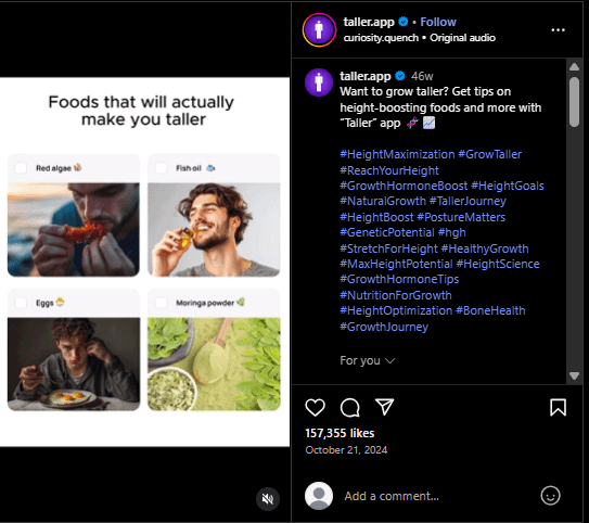 Taller is an app that helps users maximize perceived height. Growth leaned heavily on short-form video and influencer partnerships. Two main accounts drove roughly 72M views; the brand exploded on IG Reels with ~70.7M views, ~119K followers, and 291 reels posted.