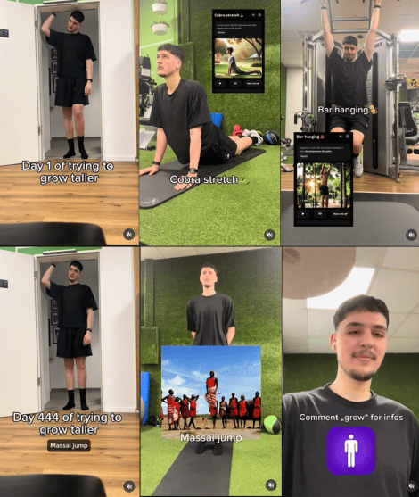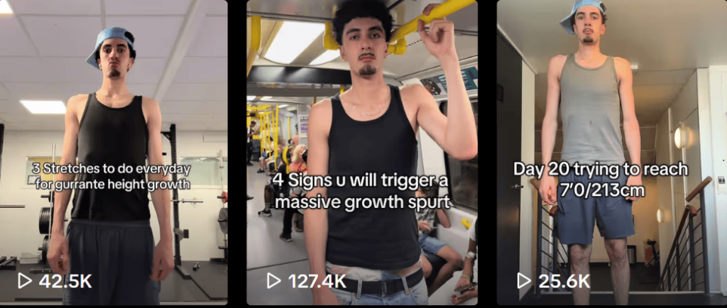 This year the focus shifted to reposted collabs with a simple serialized hook: “Day X of trying to grow taller.” Those clips repeatedly hit big and multiple posts pulled 6M+ views.