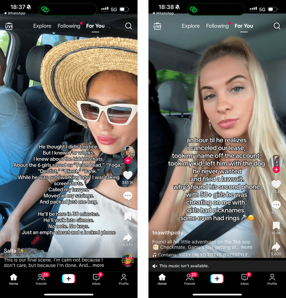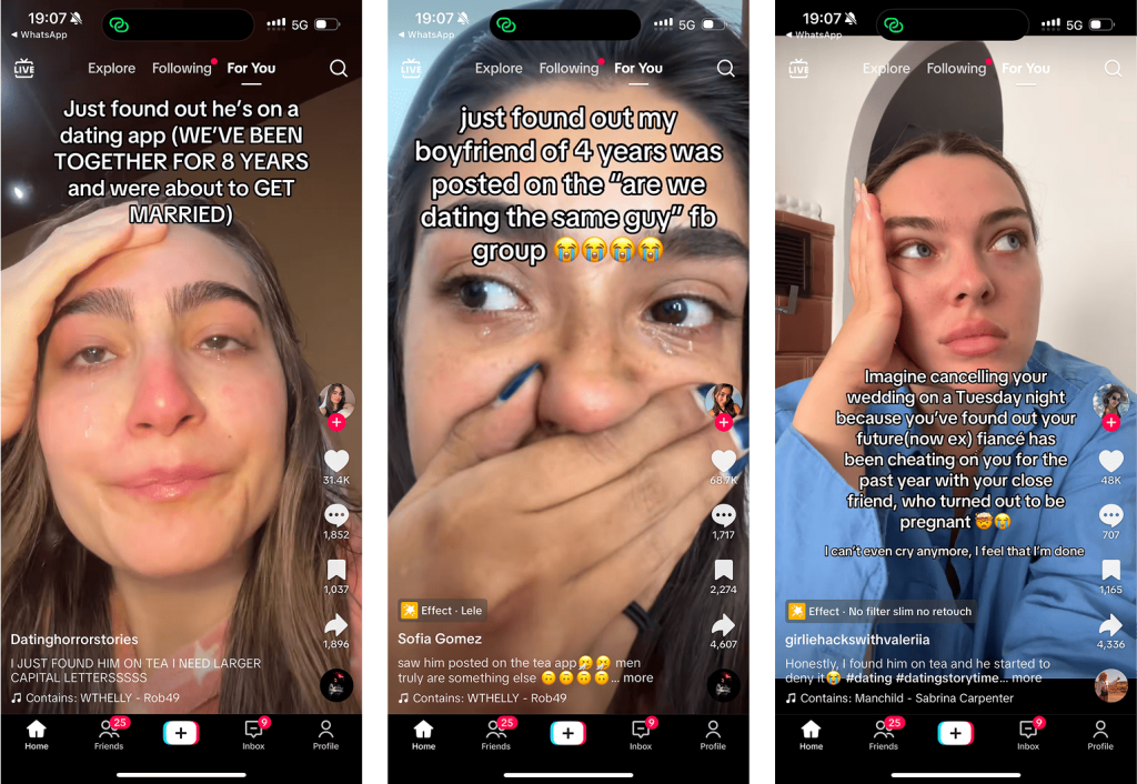 Getting views in this category is pretty easy because emotional videos about dating or cheating stories tend to go viral on most platforms.