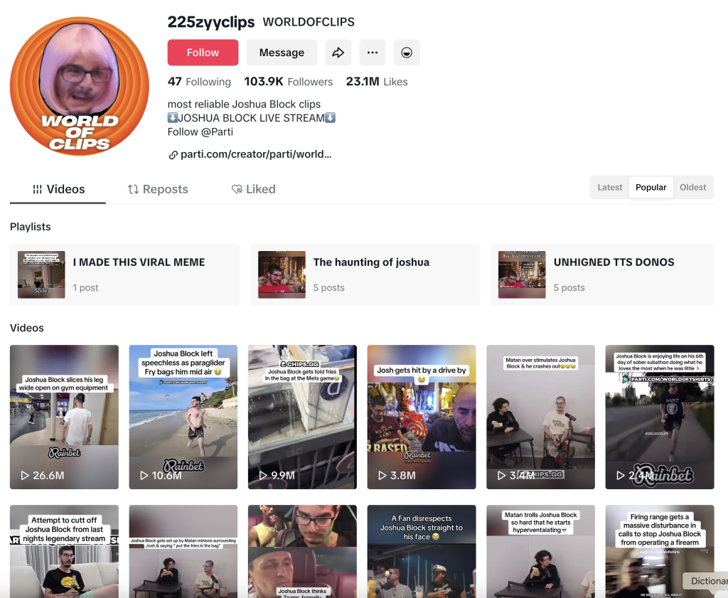 This account made 260M views clipping a single TikToker, Joshua Block, and earns income by slapping a watermark: