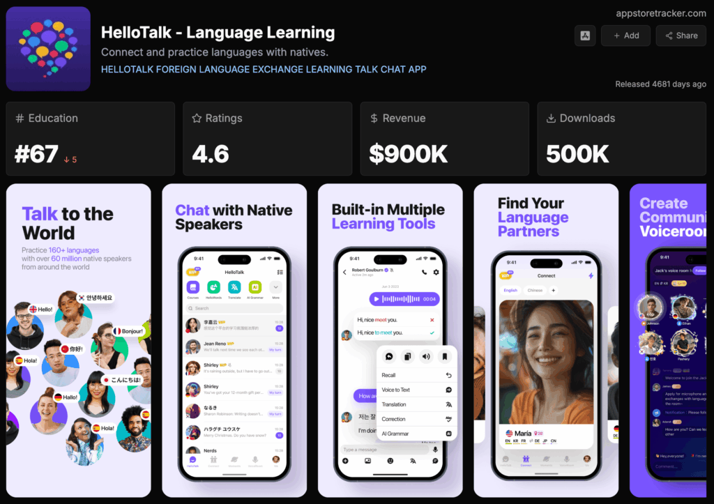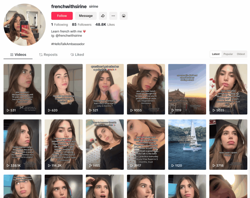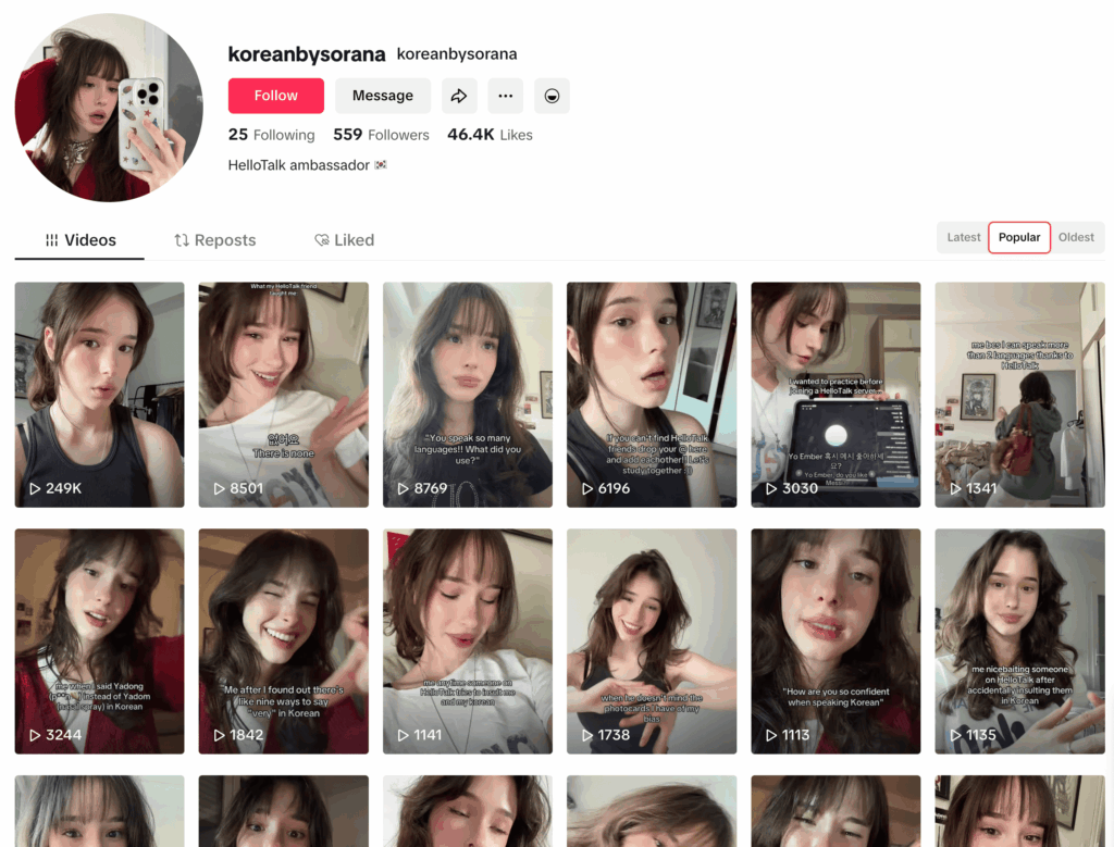 Since big, established apps don’t really need to show their product much because people already know them, the skit-style videos work well here too. If they keep up the volume, add story-style content, and naturally mention HelloTalk, they could start competing fast.