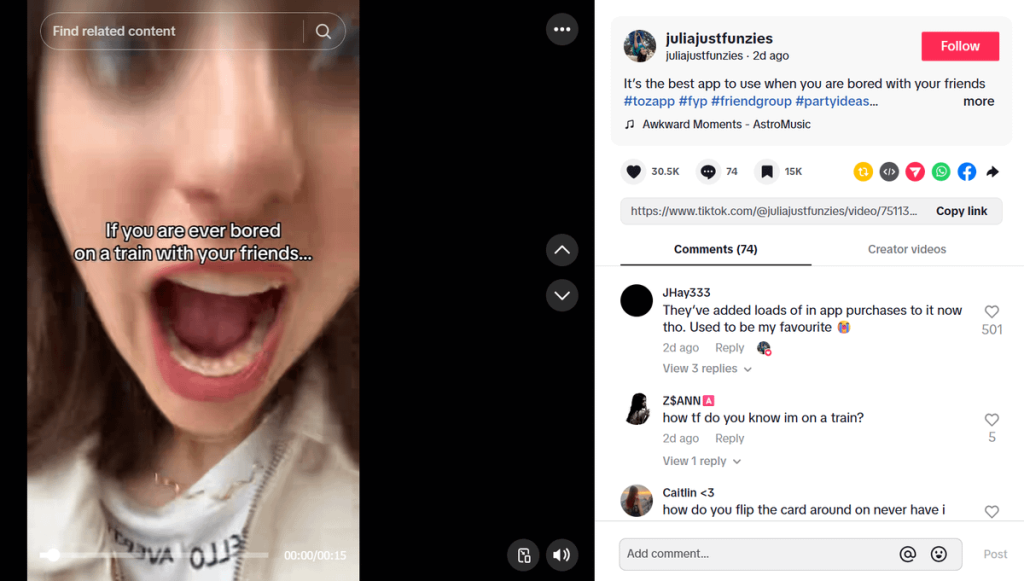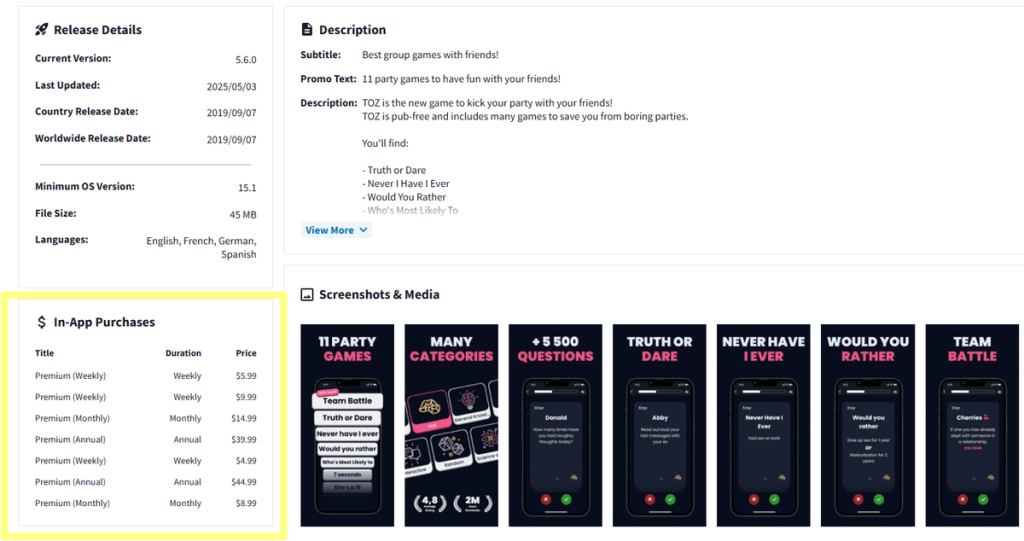 Their App store description reads that: “TOZ app is the new game to kick your party with friends! TOZ is pub-free and includes many free games to save you from a boring party.”