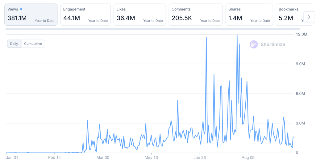 In the last 30 days, they’ve hit 38.6M views—steady, predictable, viral reach. The spikes are almost evenly spaced, showing a highly repeatable system.