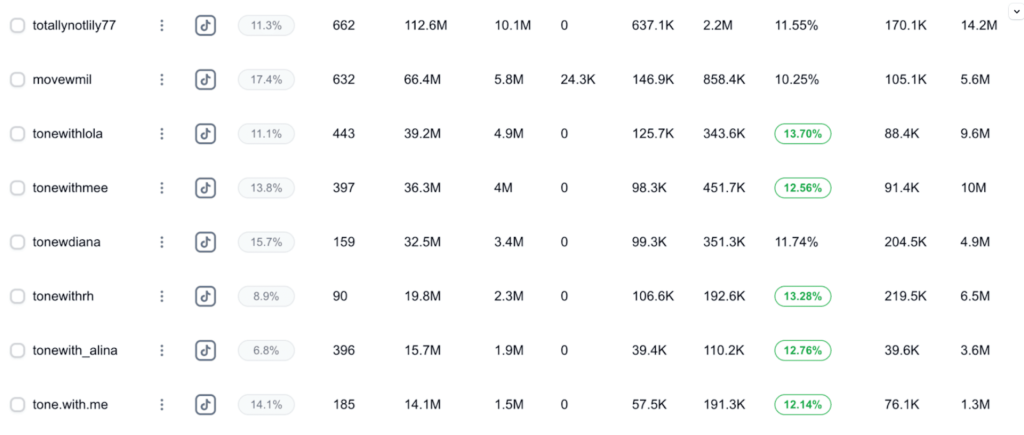 When we first checked, @movewmil had just 13 videos and around 50K views. By spring and summer, things really took off. That’s when the “tone with {name}” UGC accounts started popping up, and views began stacking up fast.