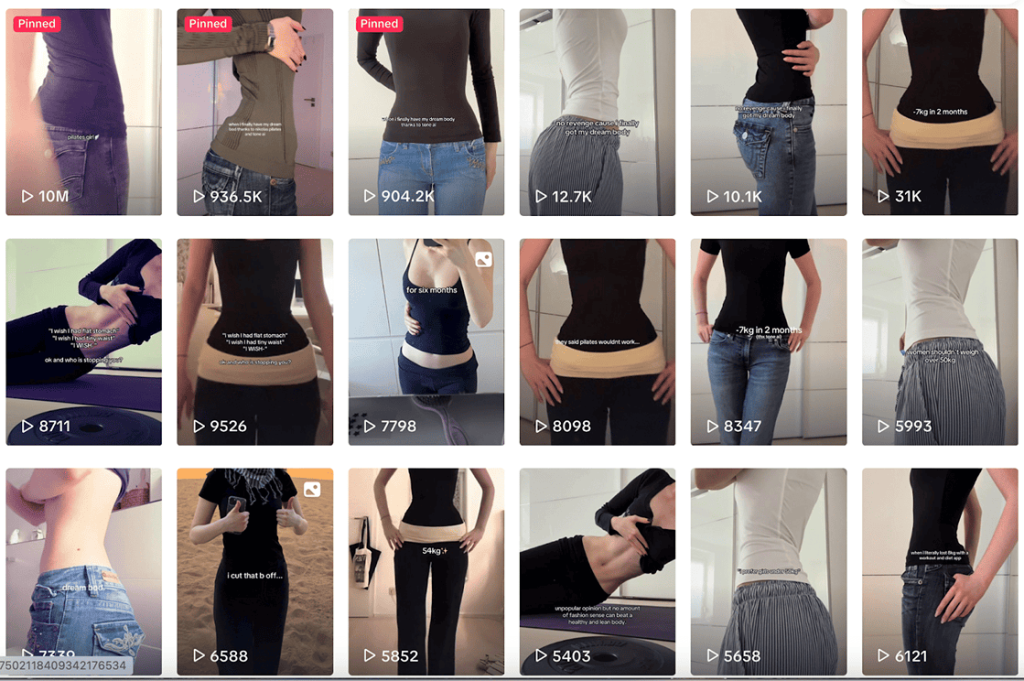Every account follows the same repeatable content formula: body transformation clips, flat-stomach shots, short captions.