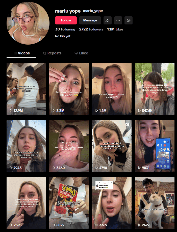All her content is in Spanish. Three of her videos blew up, with the most popular hitting 12.9M views, 731K likes, one thousand comments and 100K bookmarks.