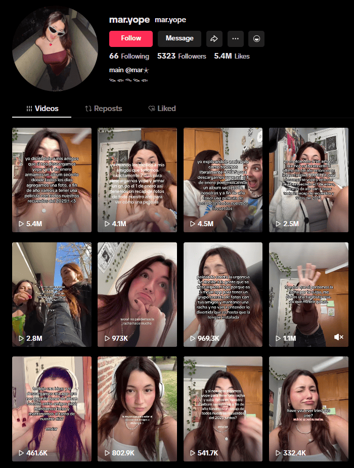 - “Me telling my friends that if we download Yope and on January 1st we create a secret album where we add a photo every day, by the end of the year we’ll have a movie with all our memories from 2025!! <3″ → 5.4M views
