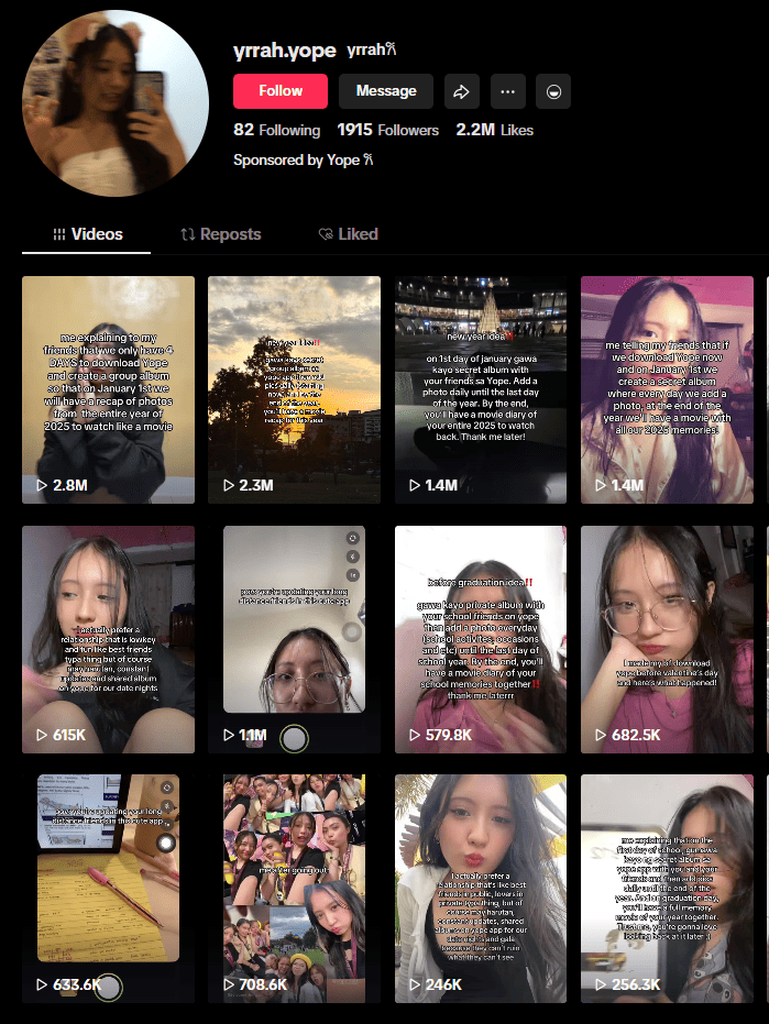 This creator has been around since the beginning of Yope’s TikTok presence. She has pulled 22 million views from the Philippines, where she is from.