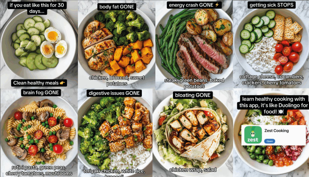Each image features a meal, along with one hook that highlights the health benefits of the ingredients and another that lists what’s in the dish.