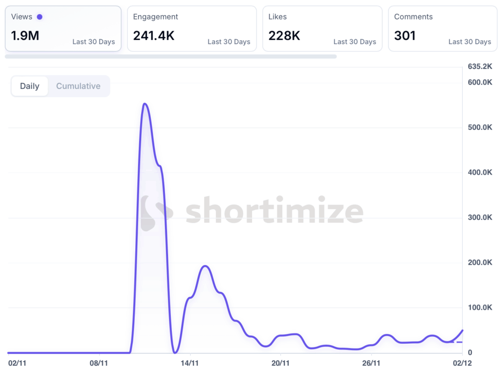 In the last 30 days, Cravr pulled 1.9M views additional views with 20+ active accounts, bringing their lifetime view count to 10.8 M.