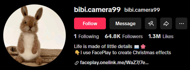 The monetization is subtle. The promo lives in the bio, where they link out to FacePlay with what looks like a referral link. The content does the selling, and the link is there for anyone who wants to recreate the same cozy prompt.