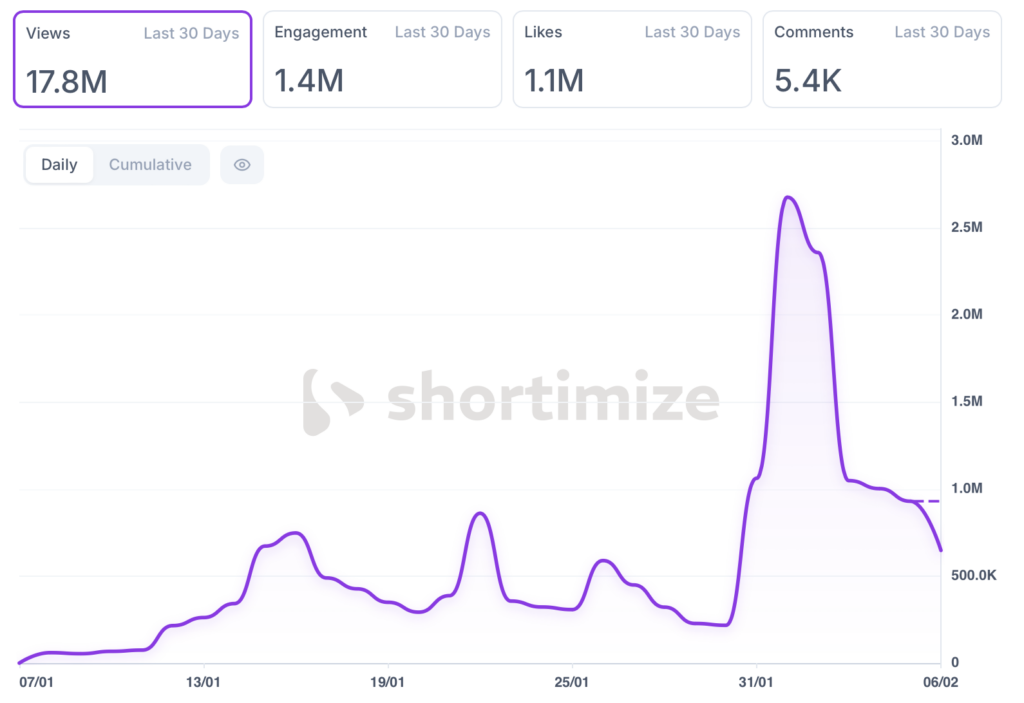 In the last 30 days they pulled 17.8M views.