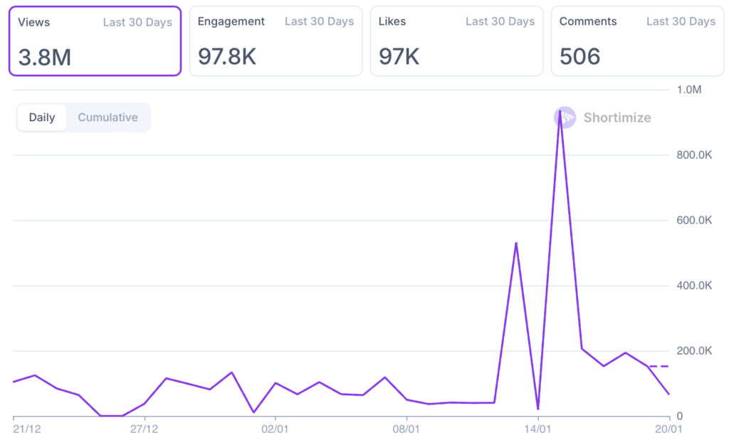 In the last 30 days, Rebrain pulled 3.8M views including one faceless POV that hit 1.9M views on Instagram .