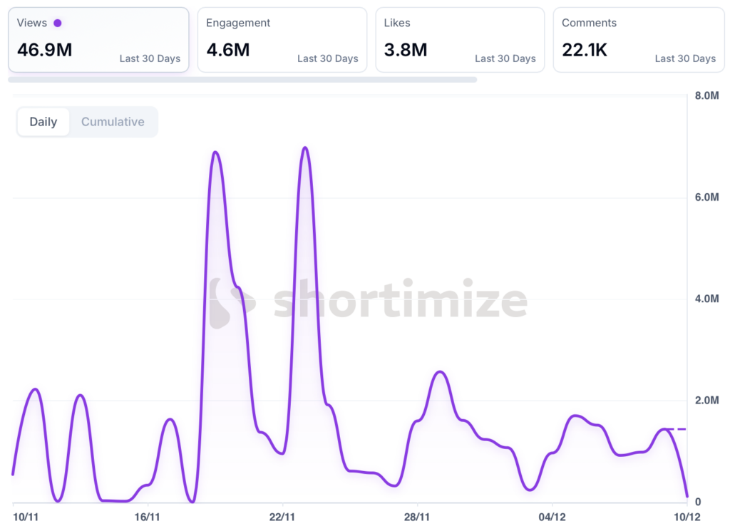 Today, they’re pulling 49.6M views a month without ever mentioning their app by name in captions, hashtags, or spoken audio.