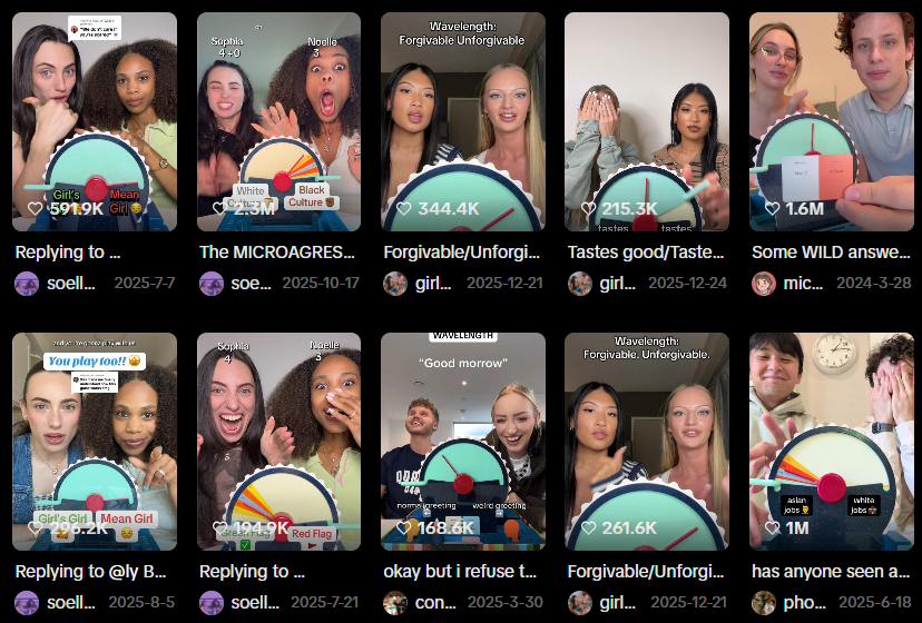 They built their audience around “wavelength” videos: a wheel, two opposite options, a hidden target, and the fun of watching people argue their way toward the right answer.