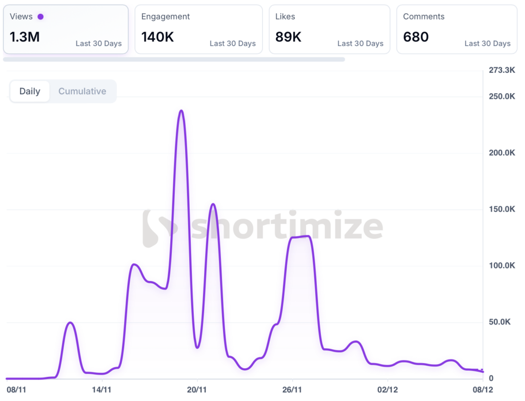 In the last 30 days, Cray Cray pulled 1.3M views. Yet, out of 55 creator accounts, only two were active in the last 7 days.